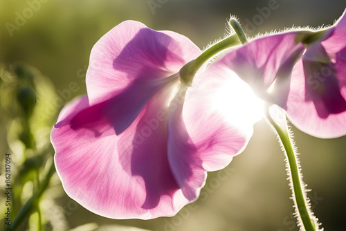 Naklejka premium Close-up of a delicate sweet pea backlit by warm sunlight, with green stems...
