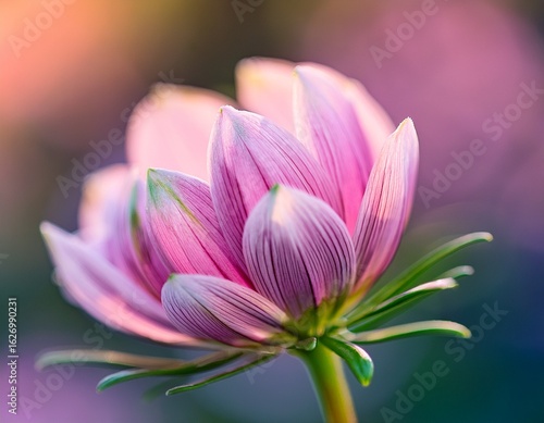 © Denise, Fototapeta premium close up of a delicate vibrant pink flower bud soft focus on a single bud pale pink petals and light green sepals blurs of pastel colors in background