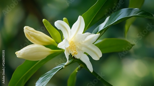 © Ariep, Fototapeta premium Close-up of a Delicate White Flower with Green Leaves