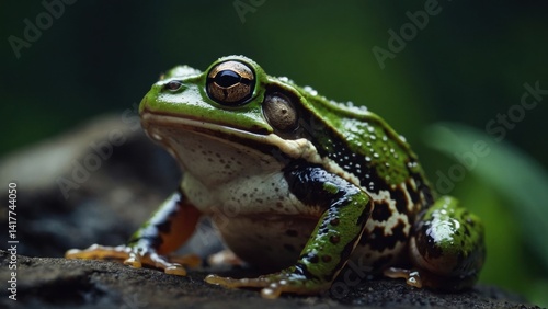 Fototapeta premium Close-up of a detailed bright green frog sitting on dark rock with a blurred...