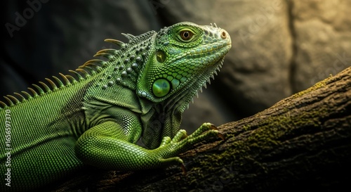 © MST, Fototapeta premium Close up of a detailed green iguana resting on a textured tree branch