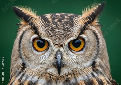 © Your Stocks, Fototapeta premium Close-up of a Detailed Owl Face with Bright Orange Eyes and Feathery Facial Disc in Sharp Focus