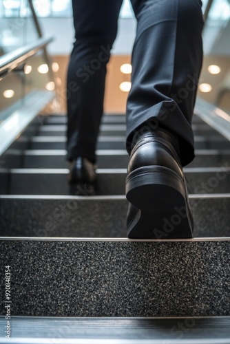 © grey, Fototapeta premium Close up of a determined businessman feet climbing a flight of stairs in a corporate building, symbolizing the steps to success and achievement.