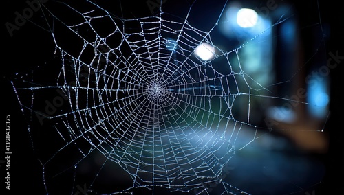 © StockHive, Naklejka premium Close-up of a dew-covered spiderweb glistening against a blurred night background.