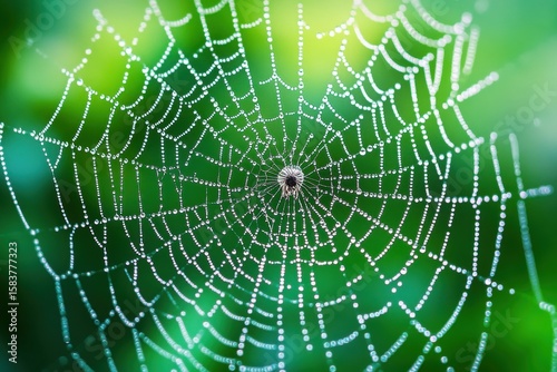 © sanaan, Naklejka premium Close-up of a dewdrop-covered spider web glistening in the morning sunlight in a lush garden setting