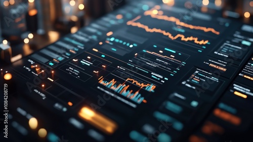 Obraz premium Close-up of a digital dashboard with data visualizations including graphs and charts on a dark interface with glowing elements, representing data analysis in technology context.