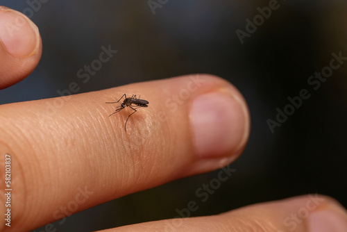 Obraz premium close-up of a disease spreading mosquito on a human hand with a dark background