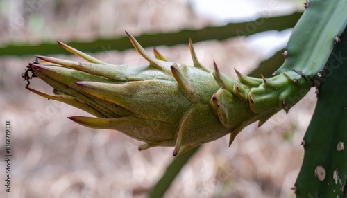 © Aris, Obraz premium Close-up of a dragon fruit bud on a plant.
