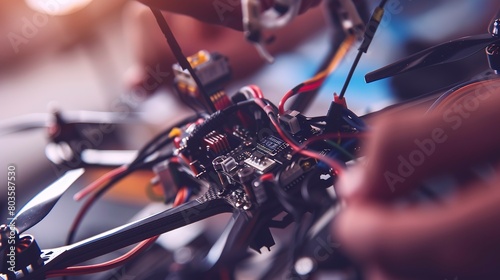 © Thanthara, Fototapeta premium Close-up of a drone being assembled, detailed propellers and electronic boards