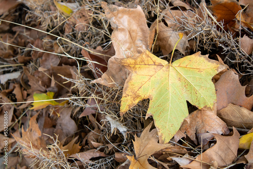 Fototapeta premium Close-up of a dry leaf falling from a tree