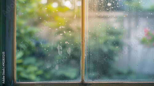© AlfaSmart, Naklejka premium Close-up of a dusty window glass with visible fingerprints and a hazy view of the outside