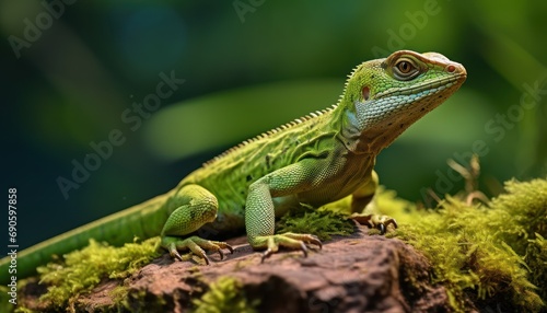 Obraz premium Close-Up of a European Green Lizard on Mossy Surface