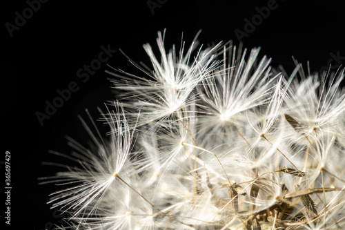© Silvia Truessel, Naklejka premium Close-up of a faded dandelion flower with details on black background, Uster, Switzerland, Europe.