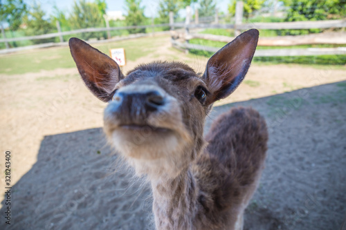 Fototapeta premium Close up of a Fallow Deer buck Dama dama. Fallow deer Dama hind looking at camera while grazing on a glade. Chleby, Czech republic. Sunny wether.
