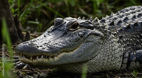 © Marnourin, Obraz premium Close-up of a fearsome reptile with rough, armored skin and sharp teeth in a lush, green marsh