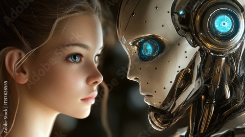© Andrii Savchuk, Fototapeta premium Close-up of a female human with a robotic face