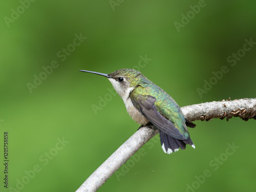 © Christopher, Fototapeta premium Close up of a female Ruby-throated Hummingbird perched on a twig