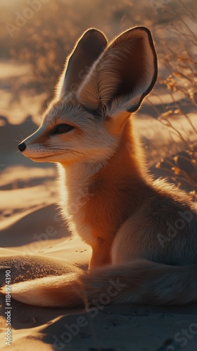 Fototapeta premium Close-up of a fennec fox in warm sunset light, highlighting its large ears...