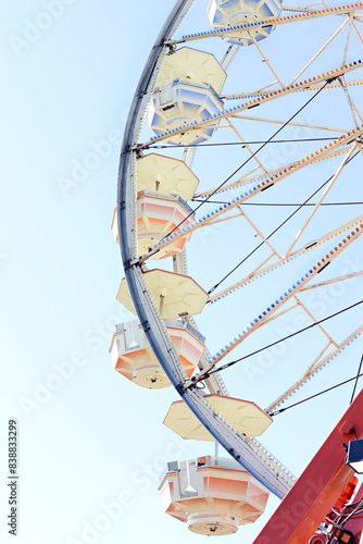 © Cavan, Fototapeta premium Close-up of a Ferris wheel against a clear blue sky at a carniva