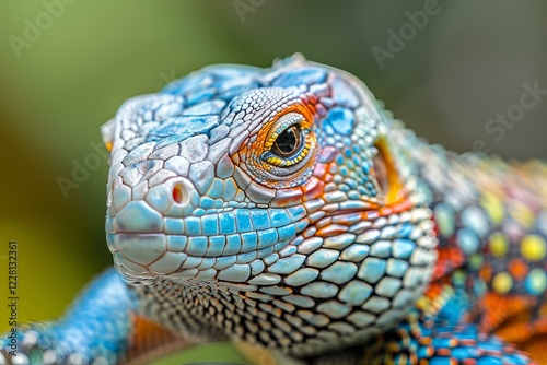 © nsit0108, Fototapeta premium Close up of a fiji banded iguana displaying its vibrant and colorful scales in a lush tropical forest setting