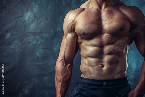 Fototapeta premium Close-up of a fit man's muscular chest and abs on a textured backdrop