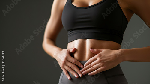 Fototapeta premium Close-up of a fit woman gently touching her abdomen, showcasing a healthy lifestyle and wellness through fitness.