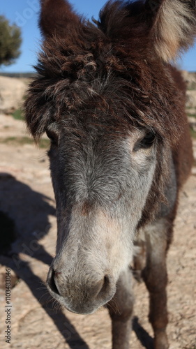 © Azedine, Fototapeta premium Close-Up of a Fluffy Brown Donkey Standing Outdoors on a Sunny Day in a Rural Countryside Setting with Blue Sky Background, Highlighting Its Cute Features and Natural Environment