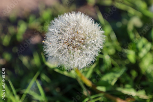 Fototapeta premium Close-up of a fluffy dandelion head against a blurred green background. The...