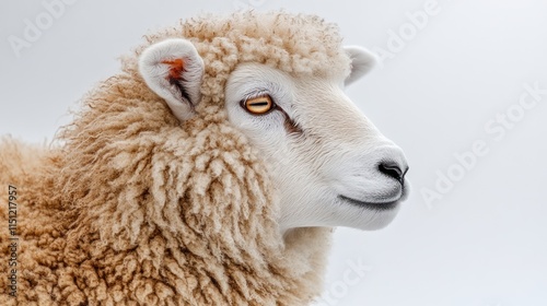 Fototapeta premium Close-up of a fluffy sheep's head and shoulders against a bright background.