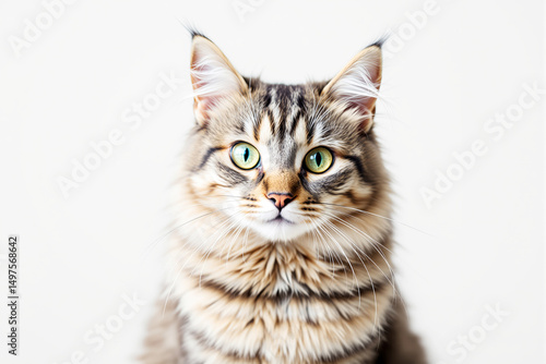 Obraz premium Close-up of a fluffy tabby cat with green eyes.
