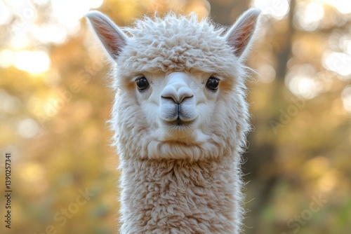 © Michael, Obraz premium Close-up of a fluffy white alpaca staring with a blurred autumnal forest in the background