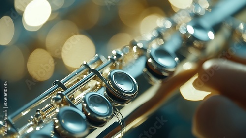 © oris, Fototapeta premium Close-up of a flute showcasing its keys and shiny surface against a blurred background.