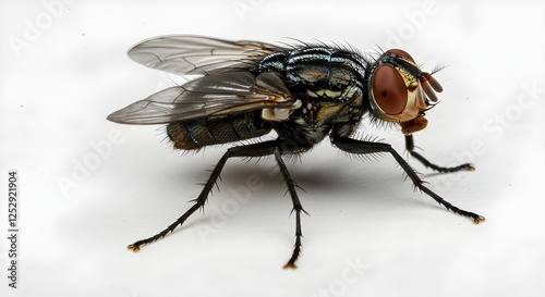 © Saif, Obraz premium Close-up of a fly insect showcasing its wings, legs, and detailed body structure, captured on a white background