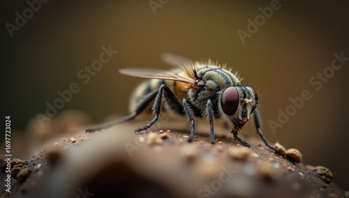 © Warcam, Fototapeta premium Close-up of a fly with intricate patterns, resting on a textured surface, showcasing detailed features and warm earthy tones.