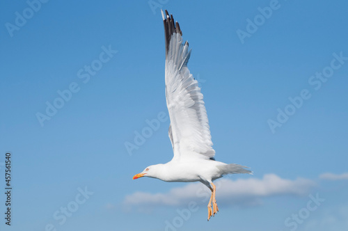 Fototapeta premium Close up of a flying seagull. Blue sky