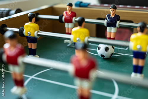 Fototapeta premium Close-up of a foosball game in progress, showcasing miniature players and a...