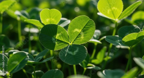 Fototapeta premium Close up of a four leaf clover in bright green grass on a sunny day