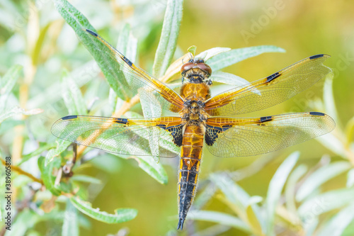 © Sander Meertins, Fototapeta premium Close-up of a four-spotted chaser Libellula quadrimaculata dragonfly