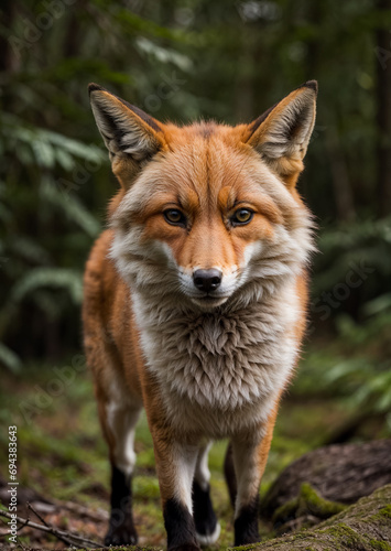 © Evgenii, Naklejka premium Close-up of a fox's muzzle against a forest background. Generative AI
