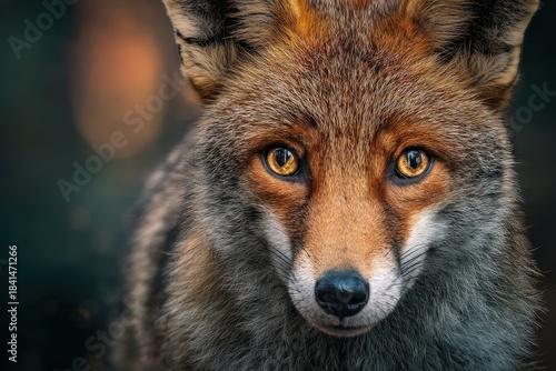 © Darcraft, Obraz premium Close-up of a fox with striking amber eyes, bushy ears, and a soft fur coat. The gaze is direct and intense, capturing the mysterious and wild essence of the animal in vivid detail