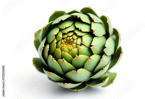 © Aldiwftr, Obraz premium Close-up of a fresh green artichoke on a white background