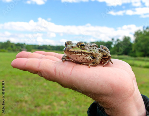 © Bayu, Obraz premium Close-up of a Frog Resting on a Human Hand with a Green Backdrop