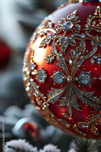 Fototapeta premium close up of a frosted christmas ornament, detailed with tiny ice crystals, delicate carvings, and a soft glow