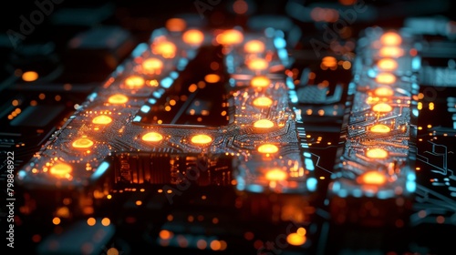 Fototapeta premium Close-up of a futuristic circuit board with bright lights and connections...