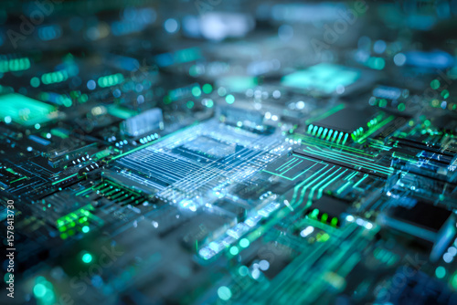 Obraz premium Close-up of a futuristic computer circuit board with glowing digital components