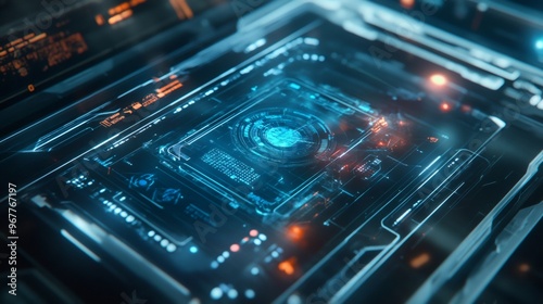 © Wish Craft Arts, Obraz premium Close-up of a futuristic digital interface with blue and orange lights.