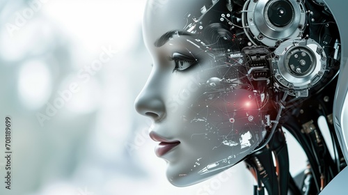 Fototapeta premium Close-up of a futuristic female android head with visible mechanical parts and digital interfaces, highlighting advanced technology