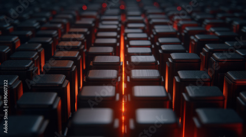 © Anucha, Naklejka premium Close-up of a futuristic keyboard with glowing red backlight illuminating the black keys in a dark environment.