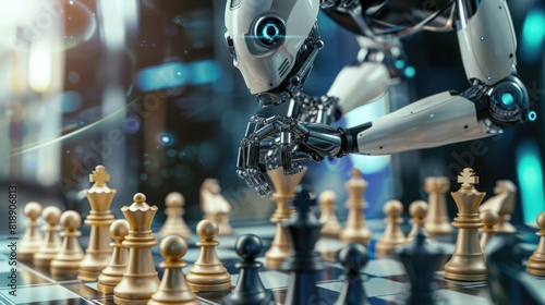 Fototapeta premium Close up of a futuristic robot playing chess. Artificial intelligence concept