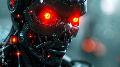 © FryArt, Fototapeta premium Close-up of a futuristic robot with glowing red eyes in a digital environment